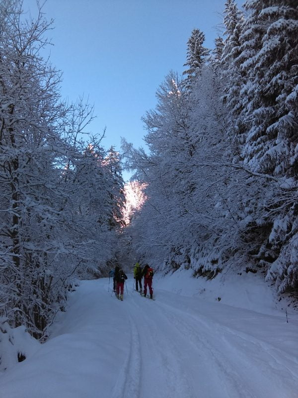 Grâce aux deux fringants 4×4 de Didier et de Rosario, nous avons pu chausser les skis assez haut sur la piste de Prodin. J’ai été distraite du reste de la piste par le spectacle féerique des arbres chargés de neige, entre lesquels le soleil commençait à pointer quelques rayons.