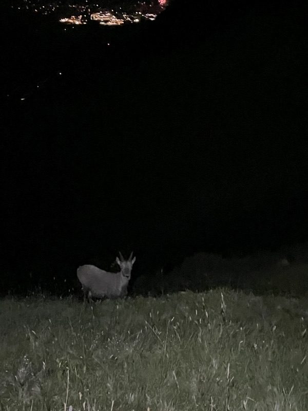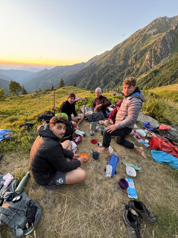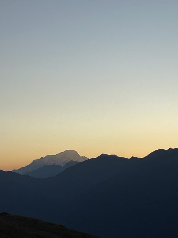 Une première étape solide pour se mettre en jambe tranquillement (ou pas). Notre guide (Baptiste) (qui n’est pas guide) nous annonce 1900m de dénivelé positif pour finalement en faire 2300m… une récompense avec une soirée passée face au mont blanc et un repas chaud partagé avec les grenouilles.