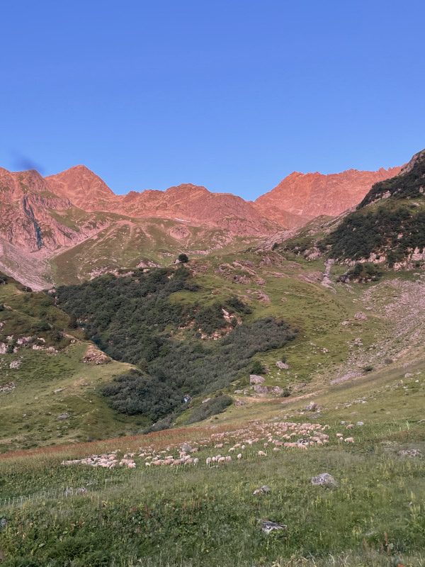 Un levé aux aurores nous a permis d’apprécier un tableau orangé face au toit de l’Europe. Un café, un Gerblé, chaussures lacées et un Baptiste (l’autre) pas réveillé. C’est parti pour jouer les apprentis peintres en balisant toute cette partie du sentier. Peinture rouge, peinture blanche, arrêts fréquents ont rythmé les 11 km de la journée. Une journée chargée qui s’est arrêtée plus tôt que prévu, espantés par la beauté du cirque des Férices. Un paysage à couper le souffle, tout autant que la température de l’eau de la rivière en contrebas.