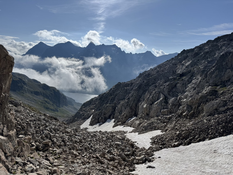 Belle montée dès le début, beaux lacs, beaux torrents, bouquetins, marmottes, col plein de cailloux, des cailloux et encore des cailloux. Que demander de plus ? Un paysage des plus sensationnels, pleins de cailloux… Petite peur de se prendre l’orage au col de la Brèche Fndue, mais sans conséquences. Un refuge de fin perché sur un promontoire juste dingue avec une vue sur la vallée impressionnante, allez visiter le refuge Jean Collet ! Il vaut le détour.