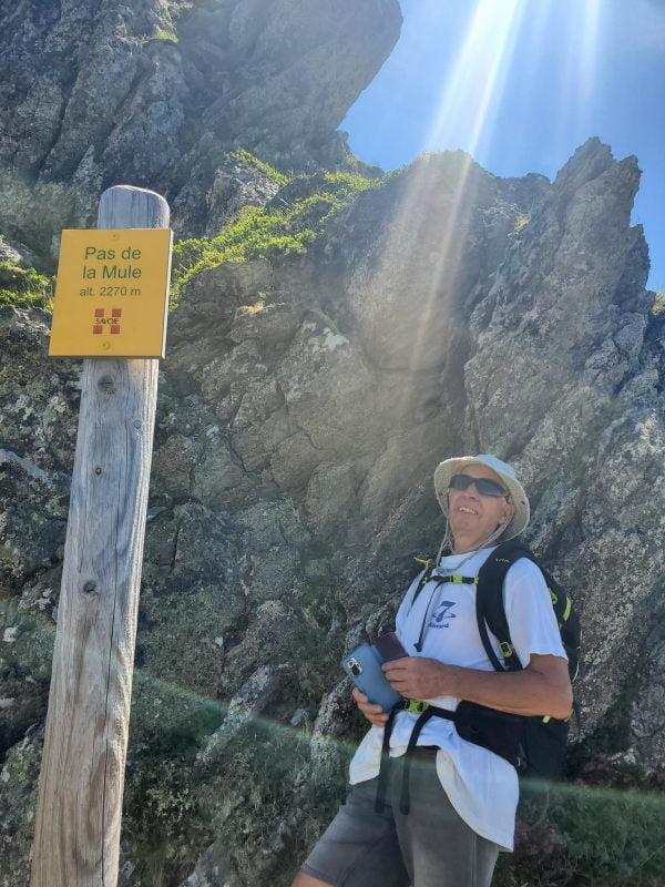 La descente dans un terrain assez chaotique versant Tarentaise, en restant assez proche de la crête sous le Mont de la Perrière et la Pointe des Marmottes Noires, permet de rejoindre le pied de Pas de la Mule. Nous l’avons atteint par des gazons raides, mais en descendant un peu plus que nous ne l’avons fait, on rejoint une trace balisée (poteau directionnel).