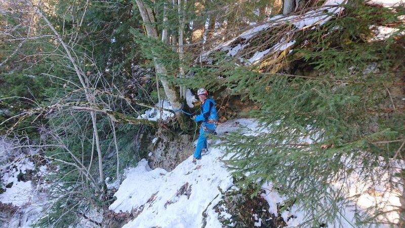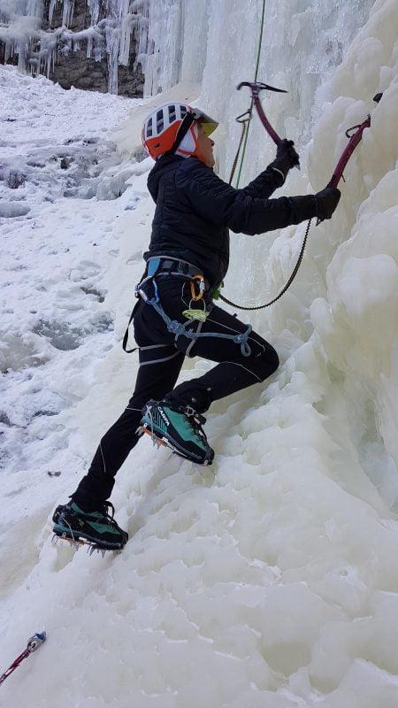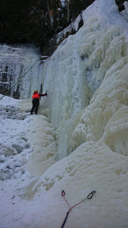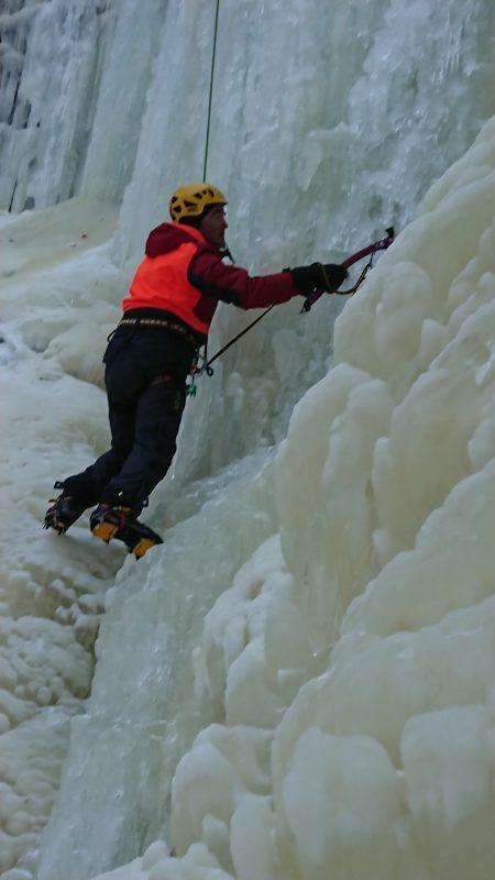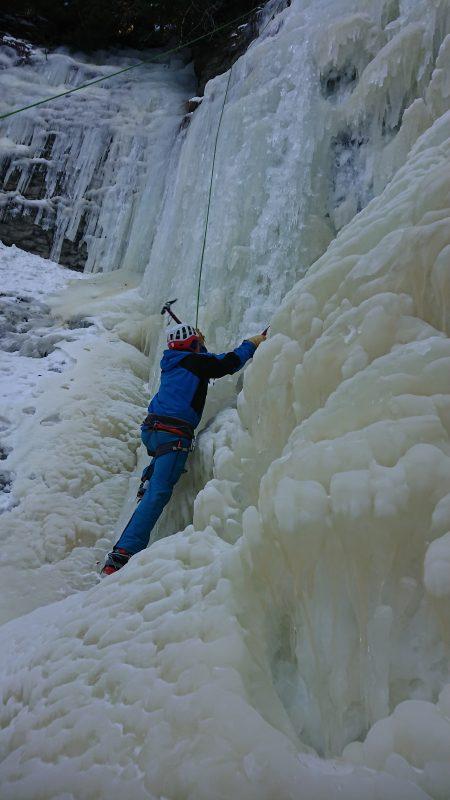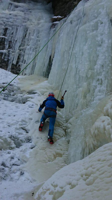 Nous allons alors pouvoir profiter de cette ligne en moulinette, ce qui présente un gros avantage du fait qu’il n’est pas évident sans entrainement d’engager en tête dans une activité aussi technique et que la cascade de glace.