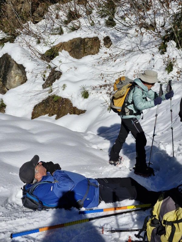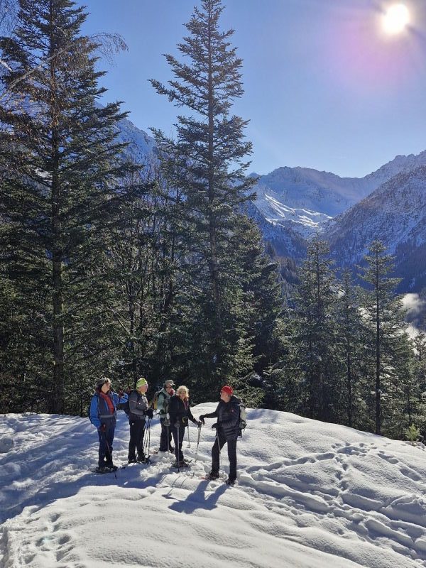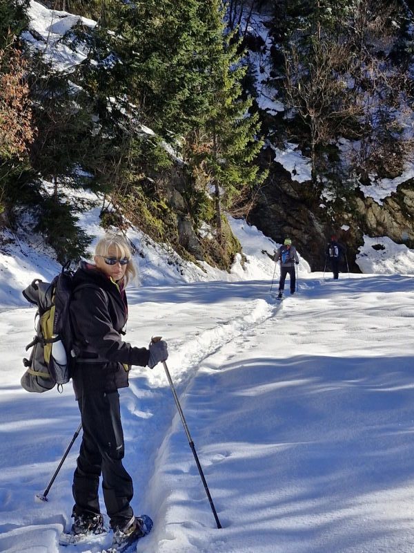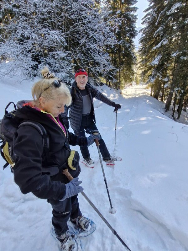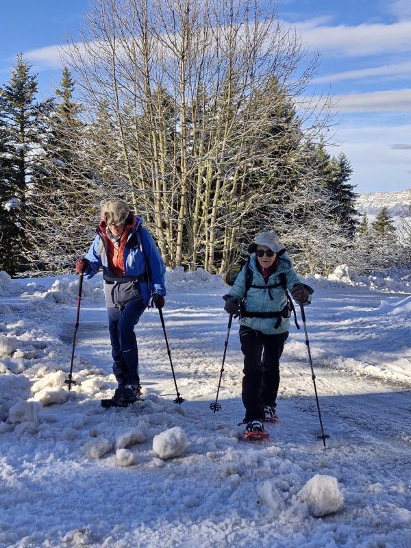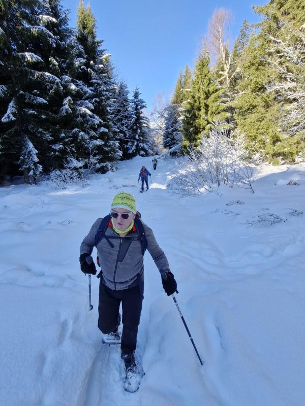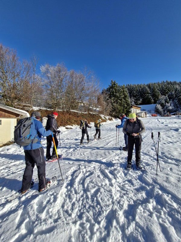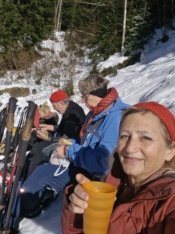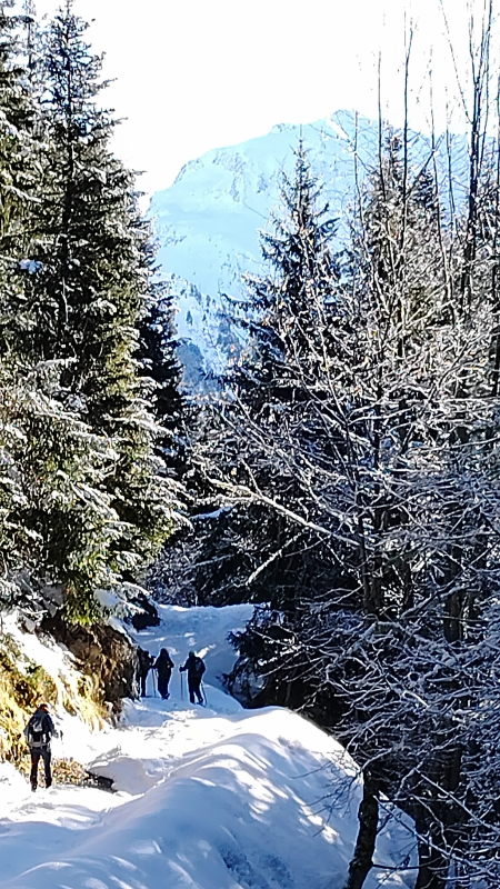 Le récit : « Après avoir dépassé le chalet (1480 m), nous avons rejoint la route forestière du Pas du Bœuf située en contrebas, et l’avons suivie sur environ 1 km en direction du refuge de la Pierre du Carre, face à l’imposant Grand Charnier qui scintillait au loin. Nous avons dégusté toutes sortes de bonnes choses au moment du casse-croûte, installés confortablement sur un talus enneigé, profitant de ce moment de pause pour reposer les muscles déjà un peu « échauffés » et taper la discute. Ensuite, nous sommes revenus par cette piste du Pas du Bœuf à proximité de la station (avant-dernier virage sur la route menant à la station, altitude 1350 m). Les plus alertes et courageux remontèrent chercher les voitures, tous admettant qu’ils ressentaient les effets de cette marche en raquettes, douloureux pour les muscles, apaisants pour la tête. »