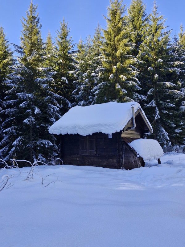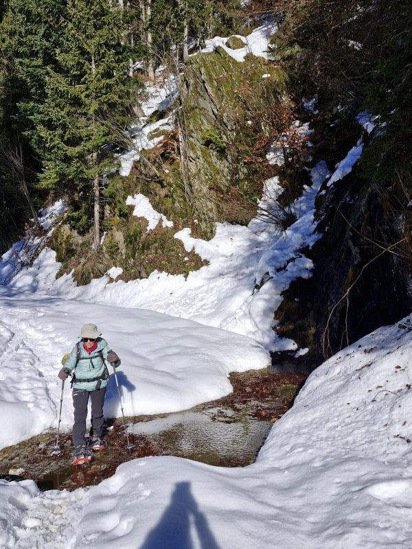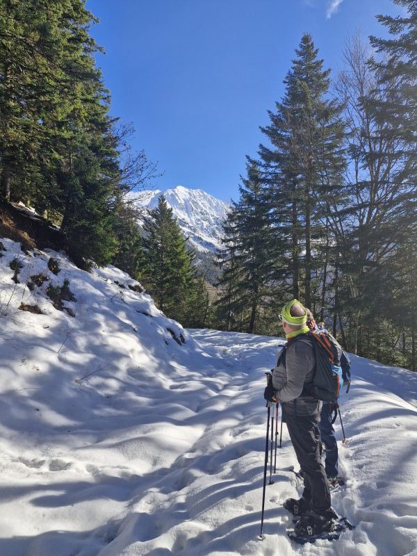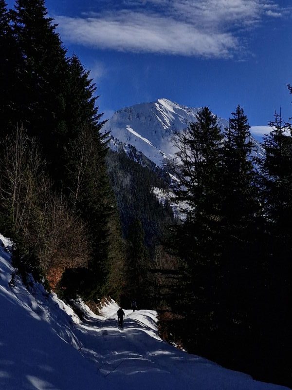 Discret au bord d’une piste forestière peuplée d’épicéas, le modeste chalet des Mouilles s’atteint en une heure de marche environ, depuis l’entrée de la station de ski du Collet d’Allevard. Aujourd’hui, notre objectif étant de découvrir ce chalet au gré d’une balade à raquettes, nous chaussons celles-ci dès la station. La neige est bien là, une trace existante nous invite tout naturellement à entrer dans la forêt. La dénivelée prévue est minime, le soleil réchauffe l’atmosphère, et nous avançons donc avec insouciance !