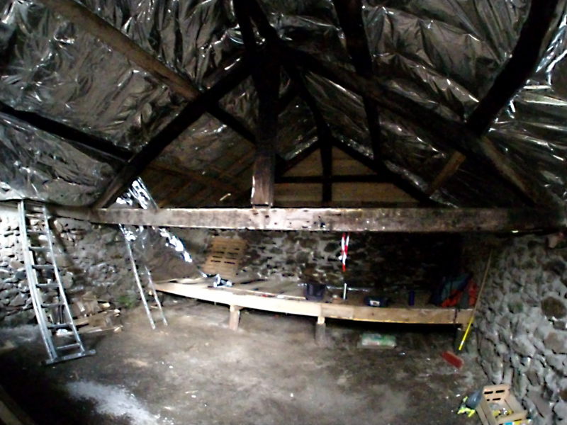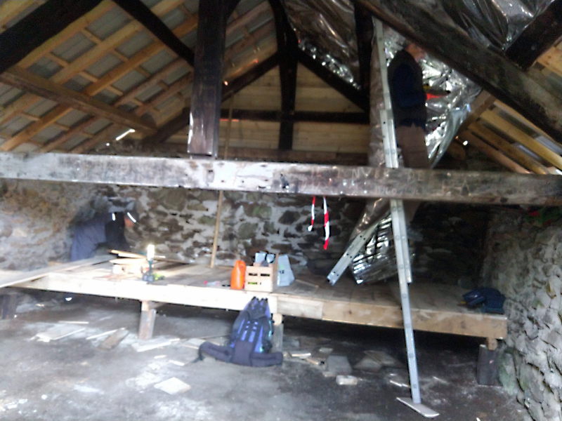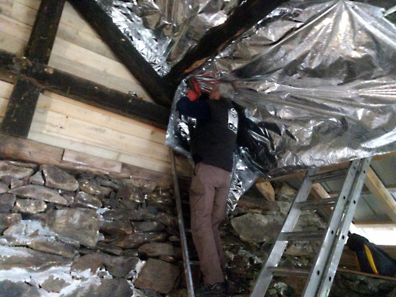 Gilles a terminé le bas flanc, Jean-Noël et Daniel ont posé l’isolant mince sous le toit, Bertrand a coupé, rangé le bois sous l’apprenti et est allé chercher le rouleau d’isolant qui manquait.