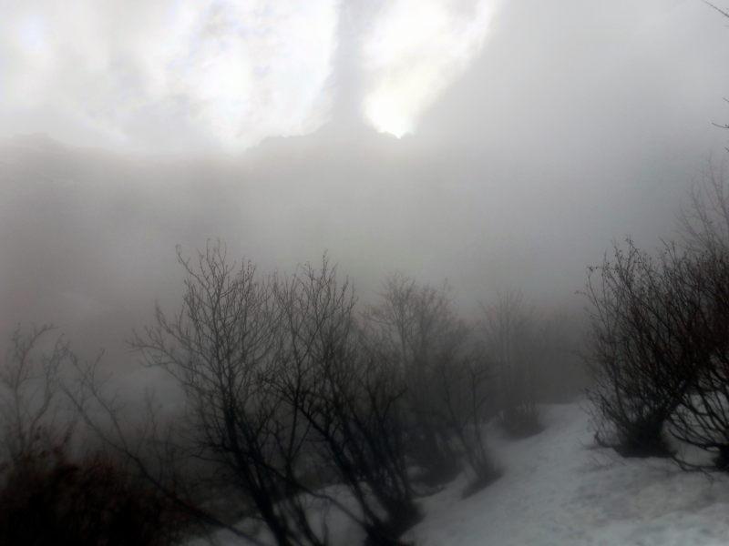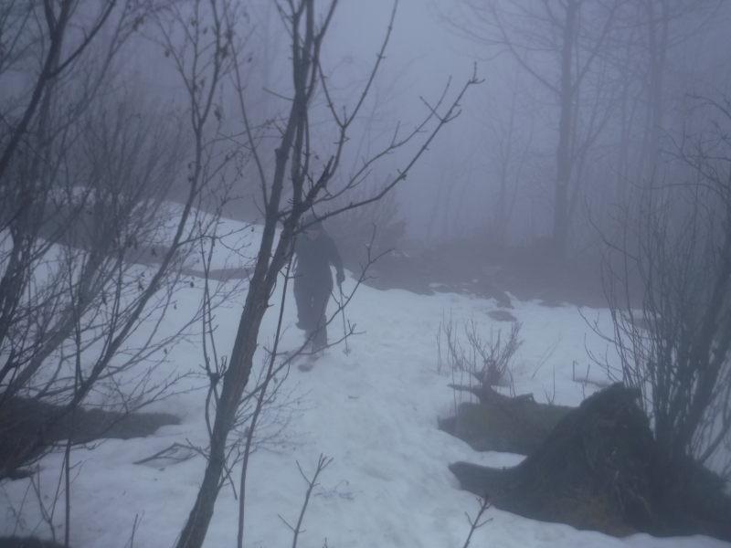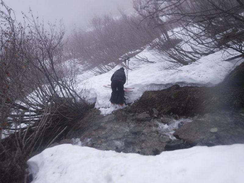Départ de Cohardin ski sur le sac. On chausse à 1520 m (après Pré Nouveau) dans la purée de pois. La grosse avalanche (elle avait emporté la passerelle il y a quelques années) qui dévale en suivant le torrent des Férices n’a pas eu lieu cette année.