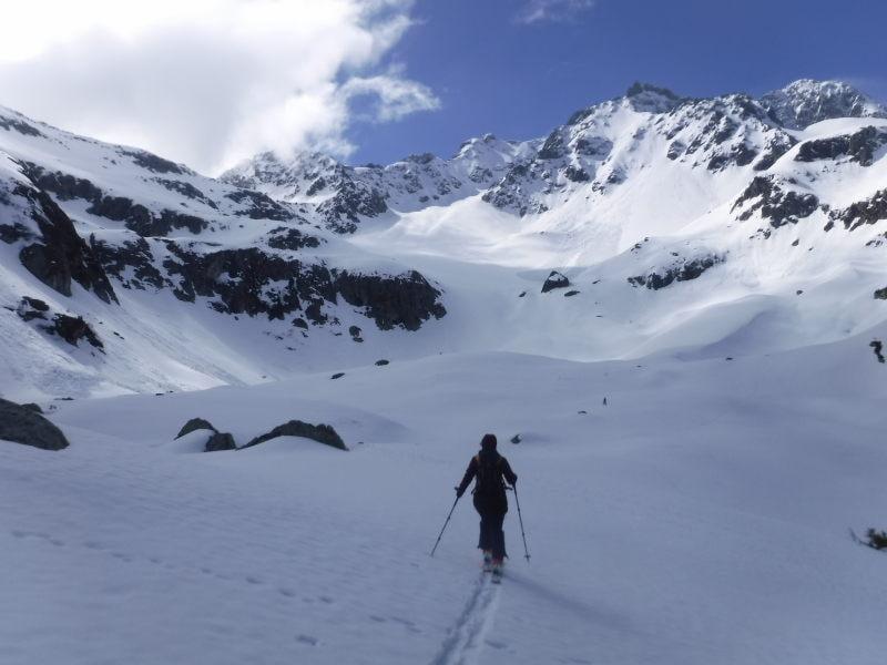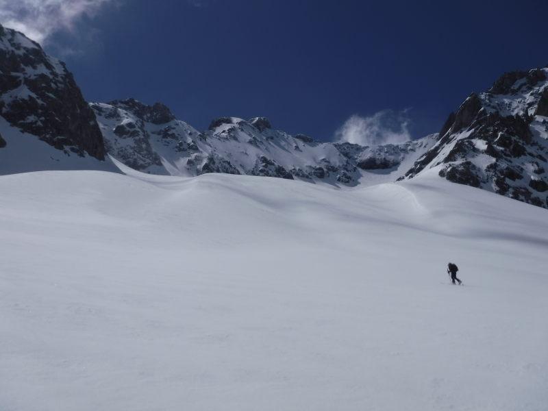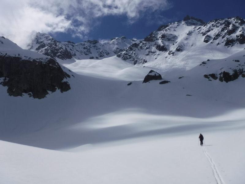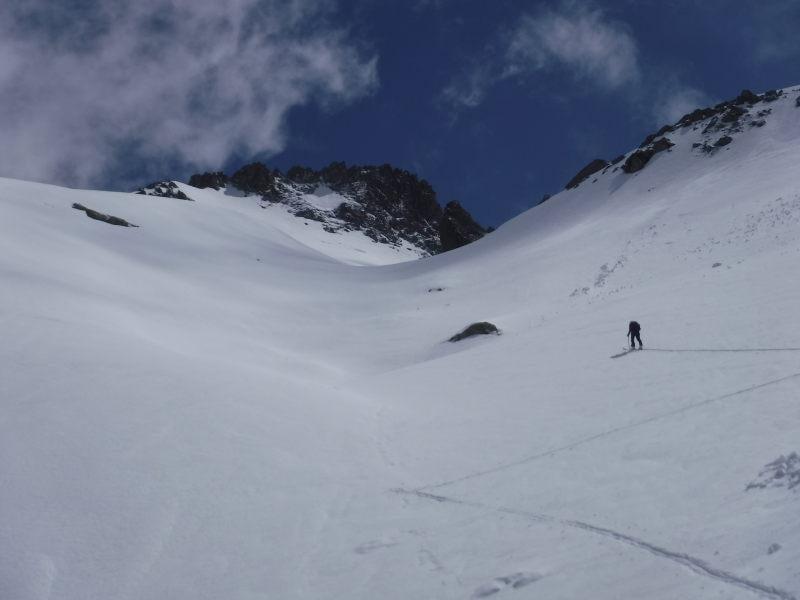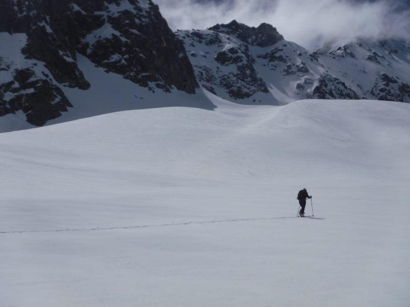 Le temps se dégage rapidement, mais il reste quelques nuages qui agrémentent le paysage toujours magnifique. Deux déchaussages pour franchir des ruisseaux (idem à la descente). Nous atteignons le col nord (à gauche).