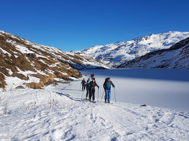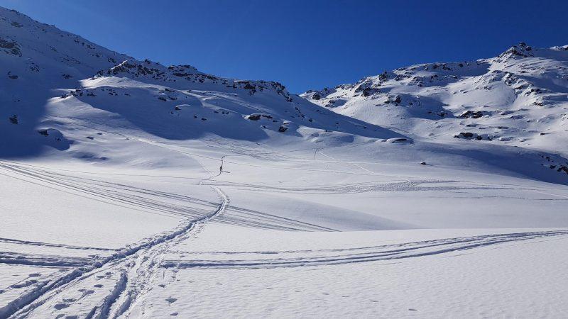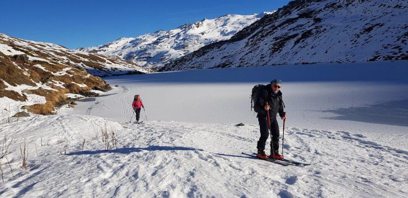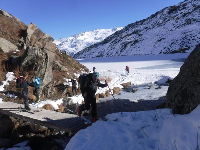 Descente superbe, on trouve même des endroits vierges de trace, qui aurait cru à une neige pareille jusqu’à 2300 m. Plus bas, c’est un peu plus compliqué pour les cuisses qui chauffent sérieusement. Reste le passage du torrent jusqu’à la passerelle et le retour sur le lac « façon ski de fond ». L’accueil du refuge et ses boissons permettent de décompresser les jambes pour terminer la descente sur la piste gelée.