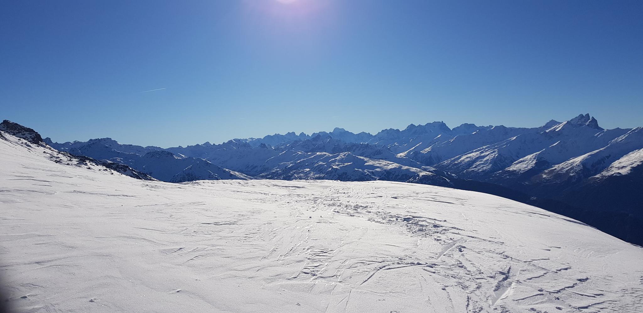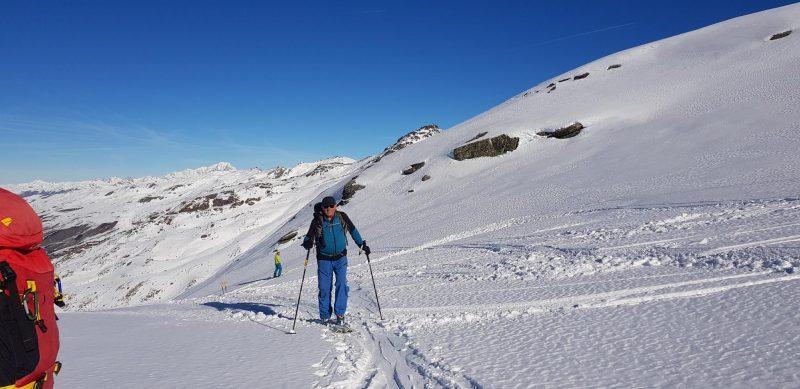 En ce début d’hiver printanier, il faut se résoudre à choisir des départs de rando en altitude pour trouver de la neige . Autre facteur décisif , l’orientation , « ce sera plutôt nord ». Allez, on tente le coup du côté des Ménuires, le col de la vallée étroite entre le Mont Brequin et le Mont du Chat m’avait laissé un très bon souvenir, pas trop de D+ pour une reprise après les agapes de fin d’année. Nous sommes 6 de BSN et 2 invités CAF Chambéry. Bernadette, Fabienne, Daniel, Jean-Michel, Jean-Pierre, Jean, Sylvaine et Xavier, au départ du parking de « La Chasse » sur la route qui monte à Val Thorens.