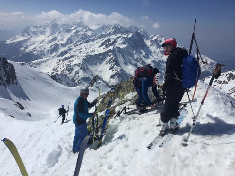 Au pied de la pente raide finale, à l’ombre, on remet les couteaux par précaution. La trace de montée est très confortable. Festival de conversions dans la partie la plus raide (37° dixit Daniel qui est équipé d’un niveau à bulle ! ). Les crampons restent dans le sac.