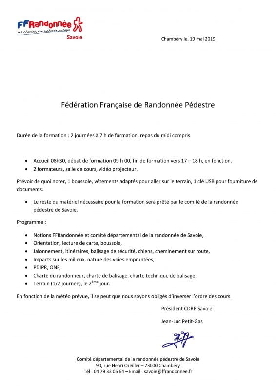 Cette formation se déroulera sur 2 jours (11 et 12 juin 2019) dans les locaux de la FFRP (90 rue Henri Oreiller, 73 000 Chambéry). Le but est qu’au moins un des bénévoles de chaque associations en charge de l’entretien et du balisage des sentiers puisse y participer. Le coût de ces deux jours de formation est entièrement pris en charge par la communauté de communes.