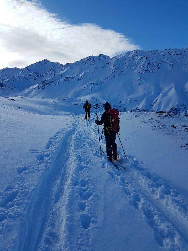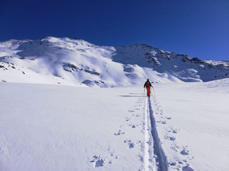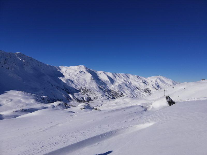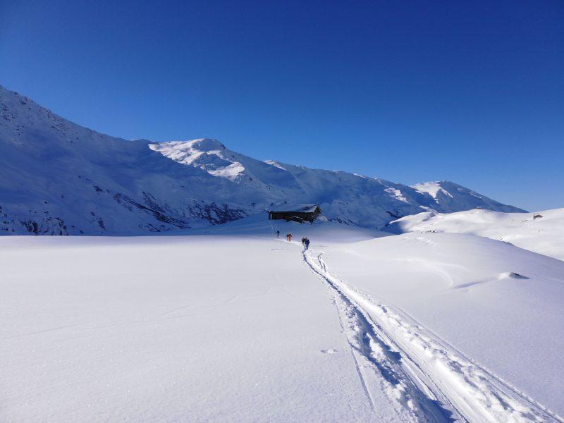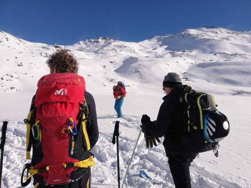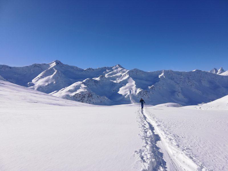 Le paysage s’ouvre devant nous au fur et à mesure de notre progression, presque immaculé de blanc, avec tout au fond le Pic du Thabor et ses imposants voisins.