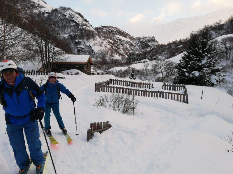 Après le refuge il restait encore une bonne partie de la vallée à faire pour retourner au parking. Deux options s’offrent à nous : 1- remettre les peaux pour reprendre le chemin de l’allée et s’engager dans une descente plus…vallonnée, ou alors 2- opter pour « le chemin des militaires » qui sont partis dans la journée et qui rejoins bien notre point de départ. Plus obscur quand à l’itinéraire, nous choisissons tout de même la seconde option, et nous ne sommes pas déçus ! Tout type de ski à été pratiqué pour ce retour, border cross miniature, micro-pont de neige en guise de passage au dessus du ruisseau, embuscade de branchages, montée en pas de côtés, marche arrière dans les aulnes pour Daniel qui a hésité à faire un petit plouf dans la rivière gelée,…