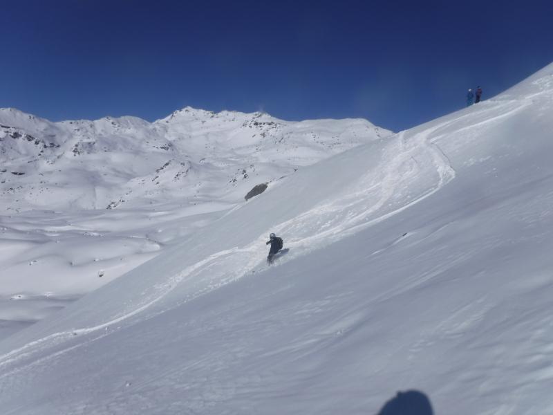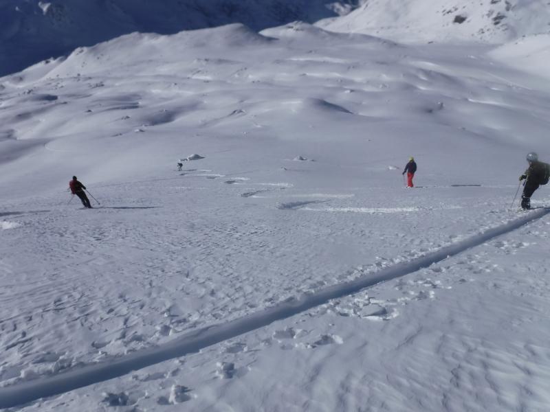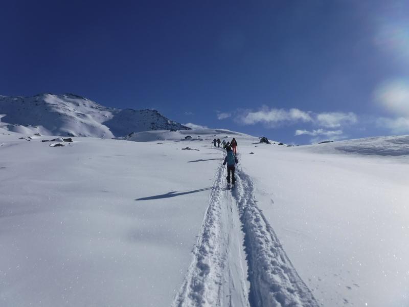 Nous sommes finalement montés sous la Roche de la Pelle, suffisamment pour avoir une jolie descente et profiter de la très belle neige qui s’étendait autour de nous, mais pas plus que nécessaire pour éviter les pentes trop raides (il y avait une débutante dans le lot !)