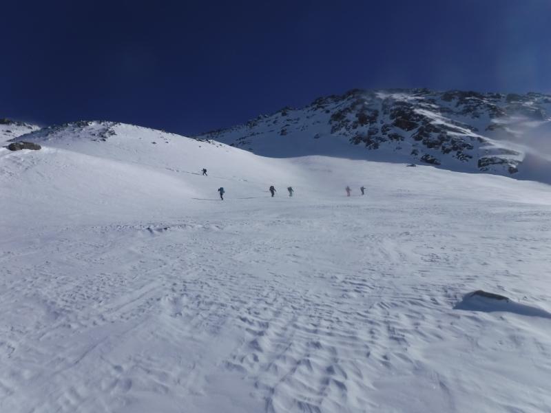 Au vue de la neige qui s’élève du sommet des arrêtes de Roche Noire qui nous font face, le vent souffle, et il est facile d’imaginer comme il doit être mordant. Nous n’irons donc pas aussi haut, nous avons tous froid et la montée progressive ne nous aide pas beaucoup à nous réchauffer. Seul un passage ensoleillé et abrité vers 12h/13h offre un peu de répit à nos mains glacées.