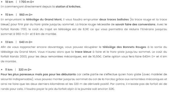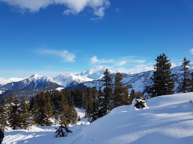 Montée confortable en forêt , sur une trace bien marquée et jalonnée ,en dehors des pistes de la station . Notre rytme « cool » avec un ciel de « grand beau » nous laisse le temps d’admirer le panorama , sur le Mont-Blanc , la Pierra-Menta , le Mirantin , et bien d’autres sommets . Nous rejoignons le Col de la Forclaz , point haut de la station d’Arêches . Petit problème de matériel pour moi , languette de chaussure droite cassée , Rosario sort de son sac le « strap » collant miracle , qui me permet de faire une réparation de fortune qui tiendra la journée . Merci Rosario.