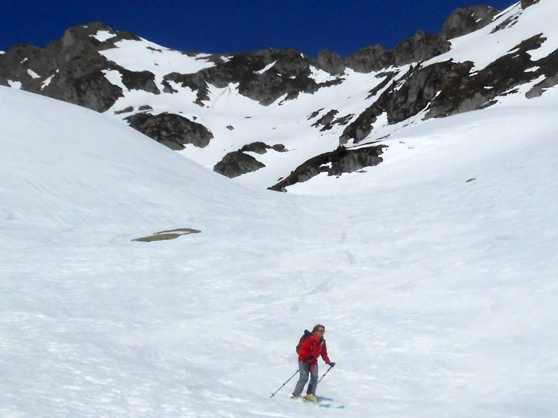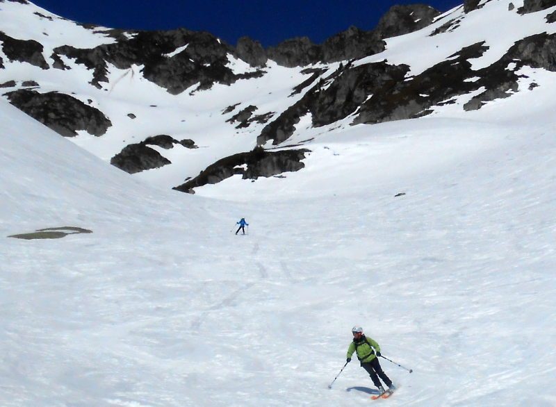 Pour résumer, solo de Sylvain sur l’arête terminale de la Grande Lauzière, versant nord (2829 m), sous l’œil décontracté de Daniel juste en contrebas, et pour eux une belle descente en neige décaillée, avec le retour assez bien « tracé » sur la route du col de la Madeleine.