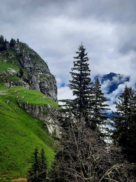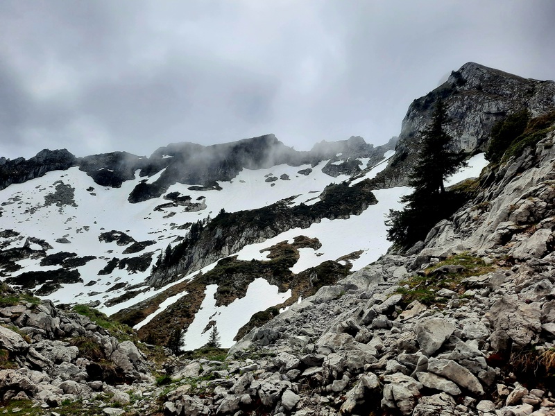 S’ensuit une remontée vers la belle Combe de la Sambuy, sous les falaises cotées 1704, mais non nommées, et l’arrivée au chalet de la Bouchasse (1710 m) ; on y découvre le versant est de la Pointe de Chaurionde, encore un peu enneigée.