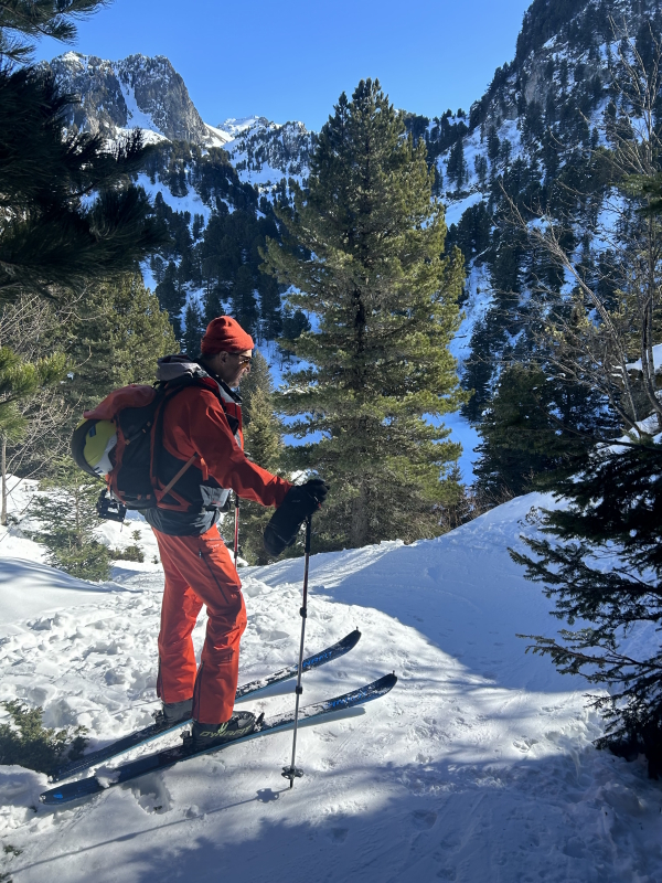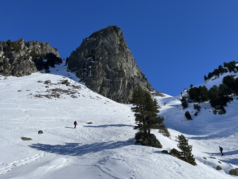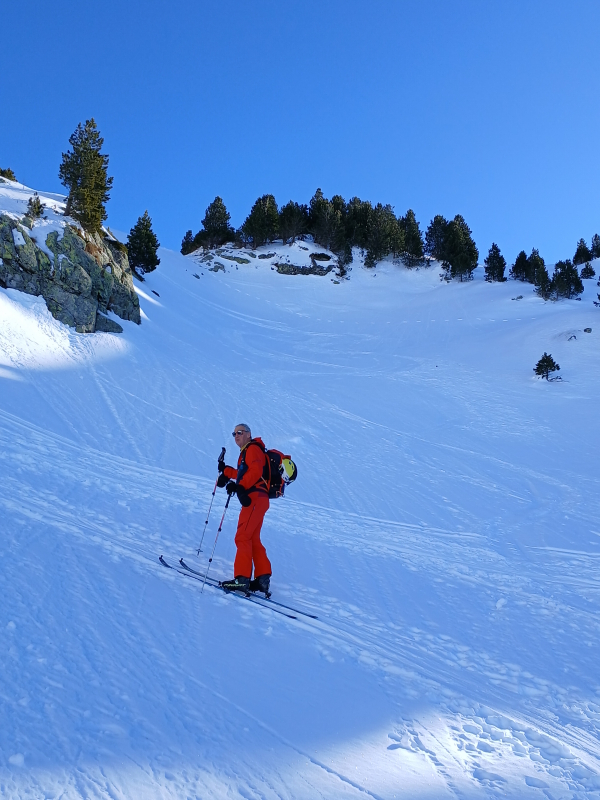 Descente par le même itinéraire, neige très correcte, jusqu’aux lacs Robert que l’on traverse. Remontée vers la Croix de Belledonne par la piste des lacs Robert. Le haut est raide et un peu gelé pour certains…