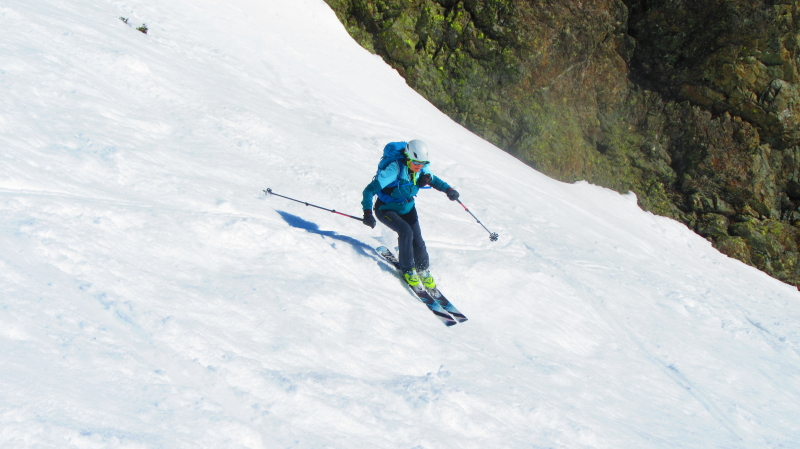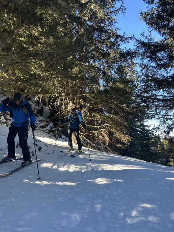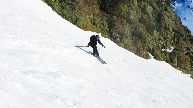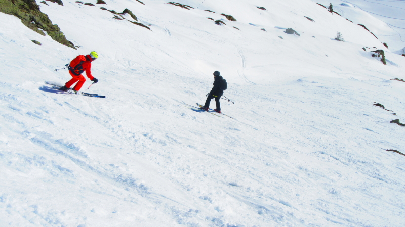 Descente par la piste de Casserousse raide en haut, avec une neige parfois dure.