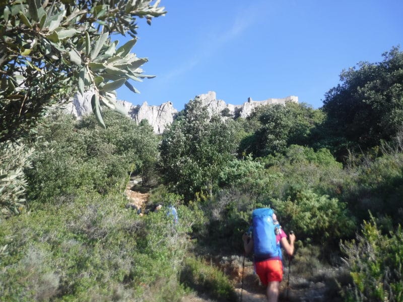 Démarrage paisible avec le château de Peyrepertuse en ligne de mire, mais à partir de Duilhac-sous-Peyrepertuse, ça grimpe raide pour atteindre le château qui est sans doute le plus impressionnant des châteaux cathares par sa taille et sa situation.