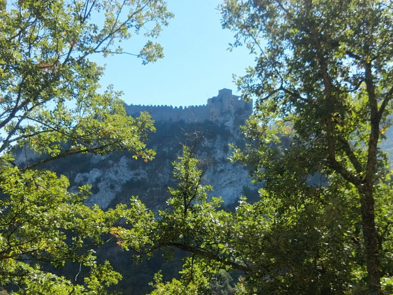 Nous suivons la rivière l’Hers, totalement à sec, dans les gorges de la Frau. A Pélail, on voit un filet d’eau et virage à 45 degrés pour remonter vers Montségur.