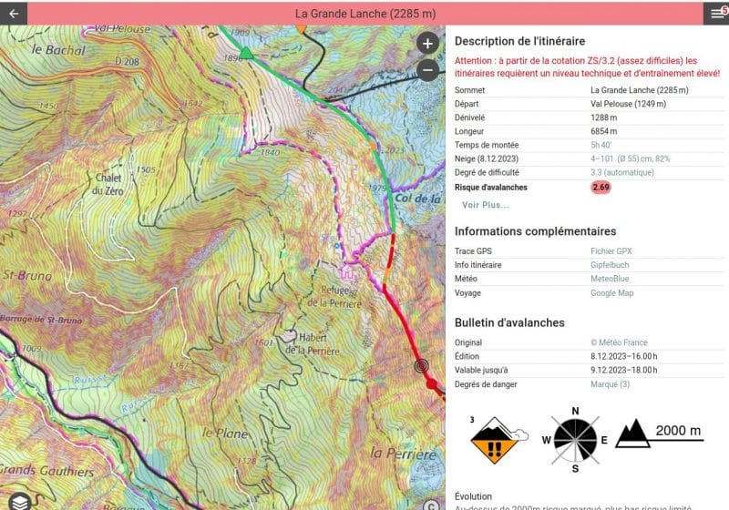 Contient toute une série d’informations : sommet, départ, dénivelé, distance, difficulté…, le téléchargement du fichier GPX et le bulletin d’avalanche du jour.