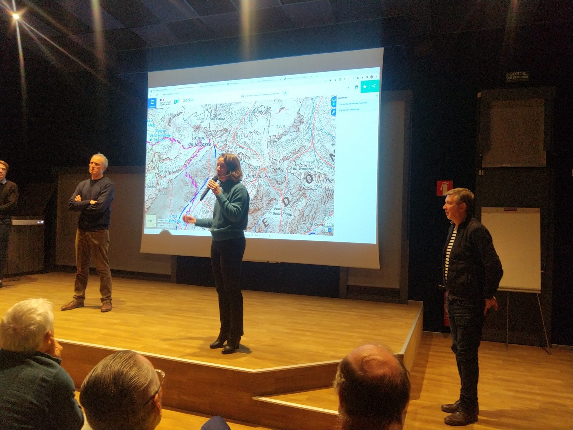 Après une brève introduction de Paul Petzl (président de l’entreprise et de la fondation Petzl) , Olivier Moret (secrétaire général de la Fondation Petzl) et deux responsables de l’IGN1 ont présenté la démarche ayant abouti à la mise à disposition par l’IGN des tracés GPS des itinéraires de ski de randonnée sur Géoportail.