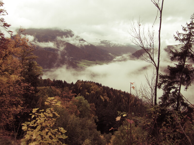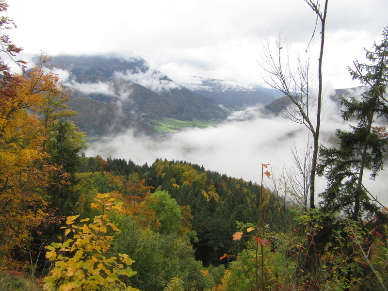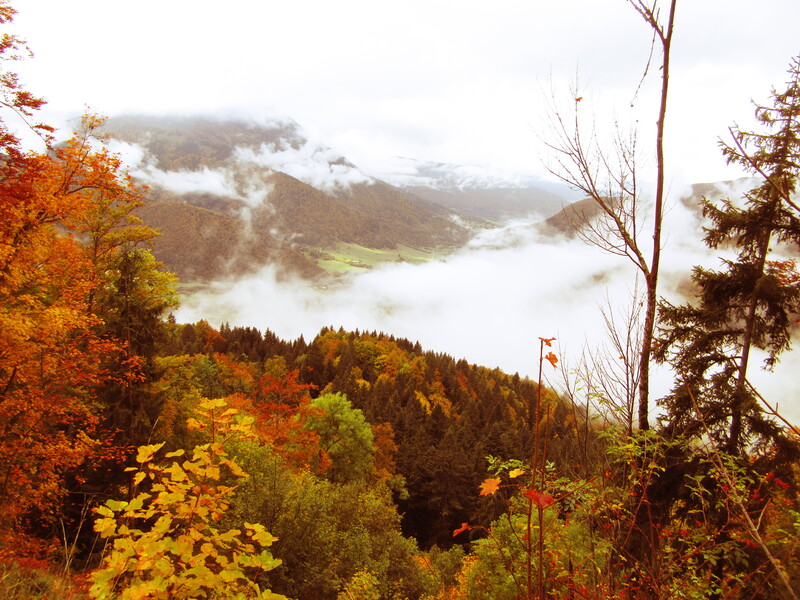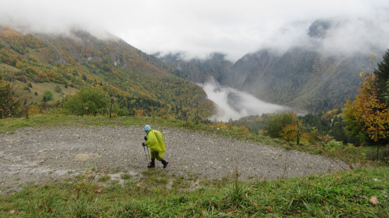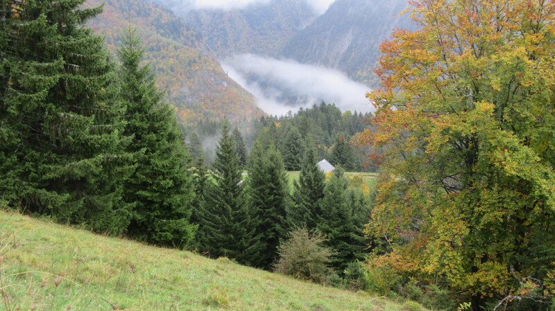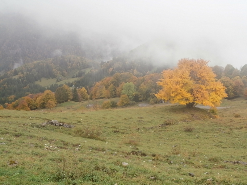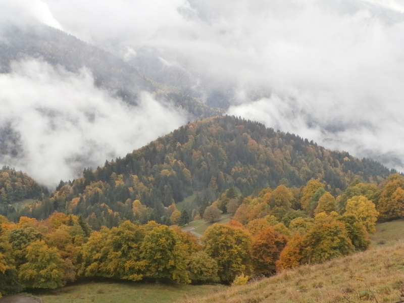En ce début d’automne, au gré de la longue piste pastorale partant du Coudray (920 m), c’est l’or des feuillages qui magnifie le paysage, faisant oublier la pluie légère et la brume dissimulant les lointains ; ses écharpes blanches soulignent les ensembles mordorés, fauves et jaunes des hêtres et érables, d’autant plus remarquables sur les prairies toutes vertes.