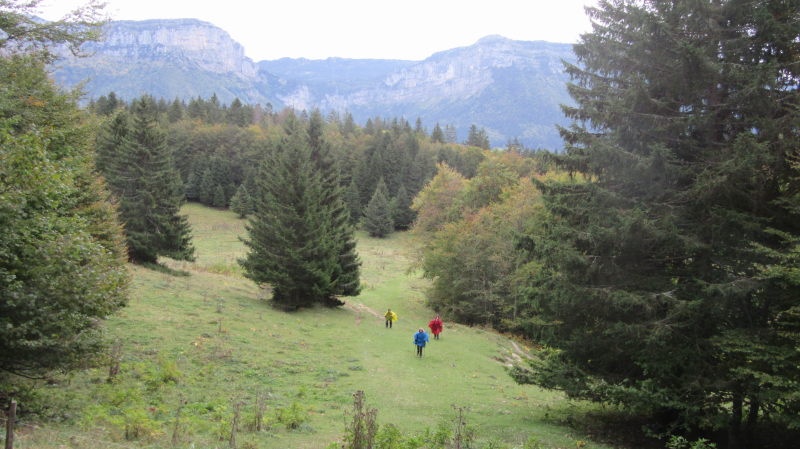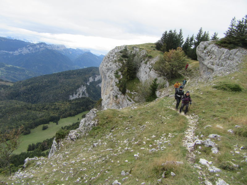 Partis du lieu-dit « Les Bruyères »(1200 m) situé tout près du téléski des Bruyères sur la D 45, nous avons rejoint le col du Grapillon (1509 m) dans une hêtraie au sol parsemé de roches calcaires karstiques, en admirant au passage une magnifique falaise émergeant au sud de Vuillette, mais non nommée sur la carte.