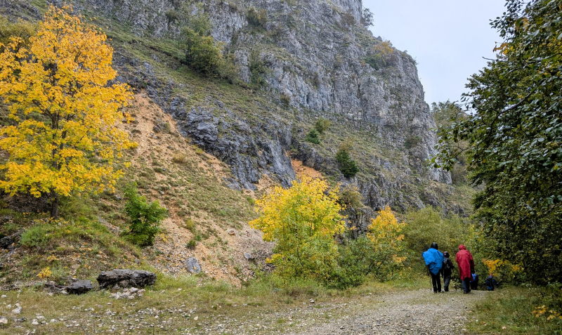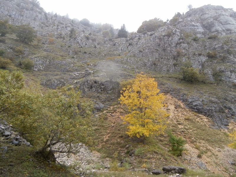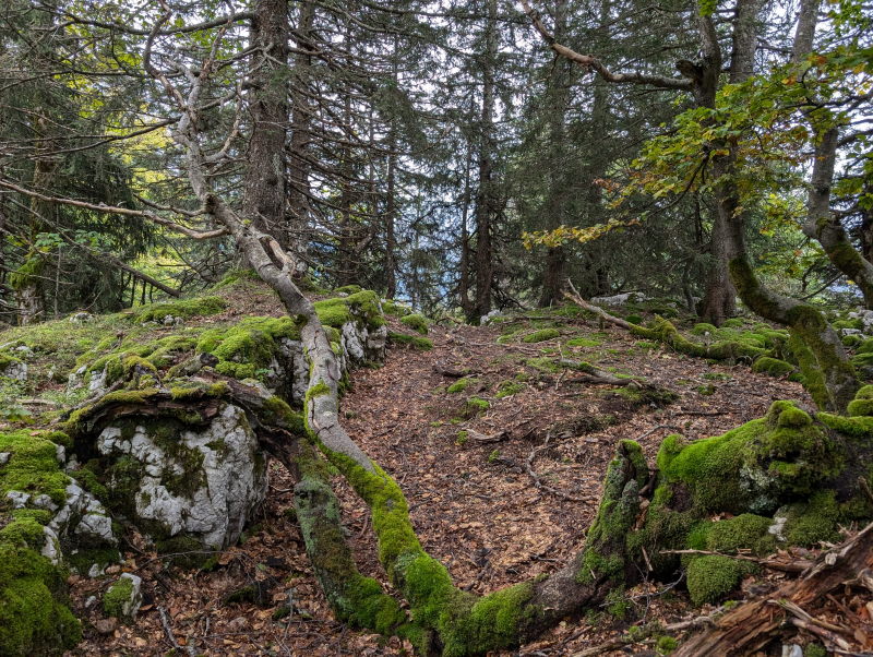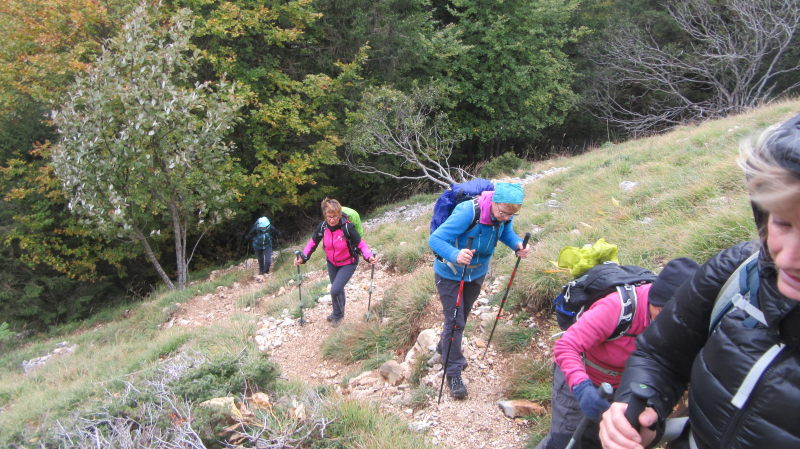 La descente au col du Mollard ( 1320 m) et à La Serra, en versant est du plateau, nous promena entre de beaux « à pic » sur un sentier raide toujours tracé parmi les roches calcaires, et heureusement bien balisé en jaune (félicitation aux baliseurs !). Une piste forestière revenant au sud nous ramena à la route départementale D 45 puis au parking du départ, ayant bouclé la boucle de 9 km.