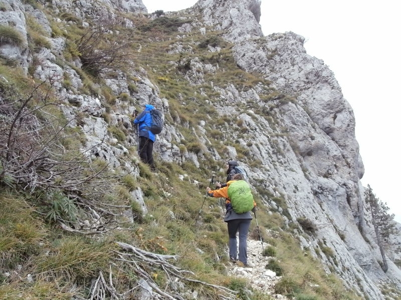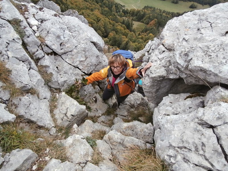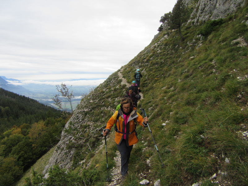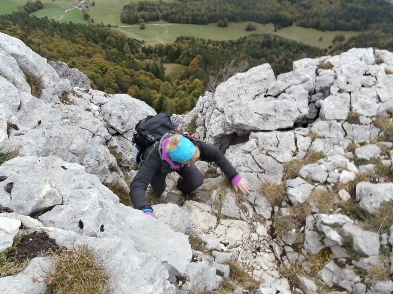 À partir de là, le vent bien frais, la marche sur le sangle longeant la falaise, puis la progression dans un terrain raide parmi les rochers gravis en « mettant les mains » ont pimenté cet accès au sommet.