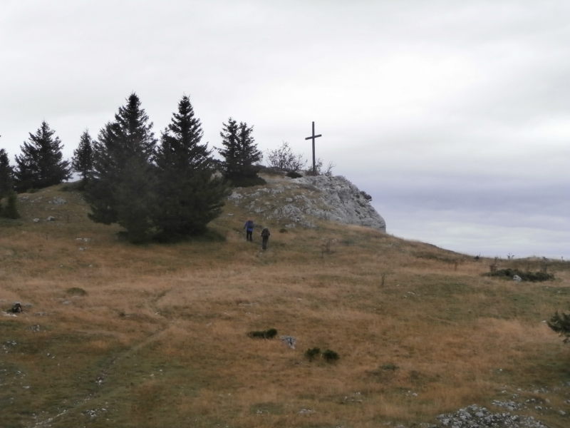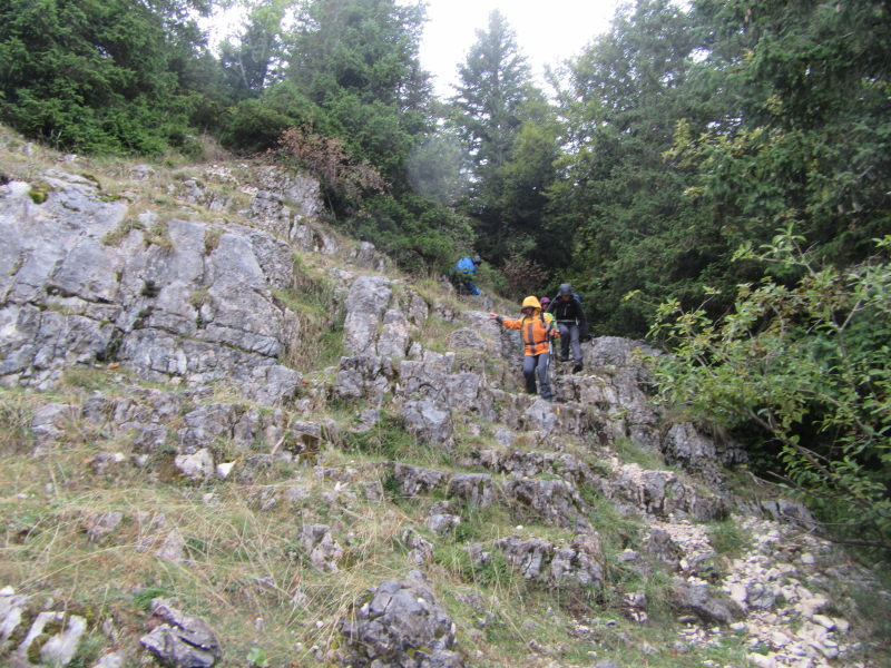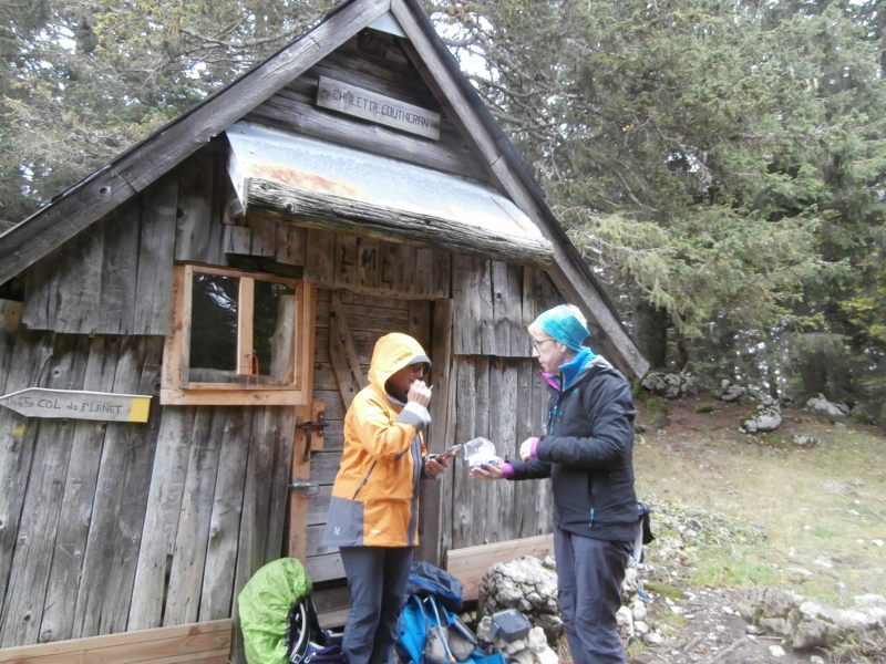 Sur le plateau sommital (1673 m), après la traditionnelle photo de groupe auprès de la croix et le tour d’horizon sur les sommets alentour, nous avons entamé la longue marche nous amenant plus au nord vers la cabane d’Outheran (1596 m). Autant dire que nous avons goûté aux reliefs karstiques, roches glissantes sculptées, gouffres, végétation moussue aux formes alambiquées, avec parfois une glissade involontaire, petites montées et descentes : la cabane rustique fut la bienvenue pour un casse-croûte arrosé par une légère bruine.