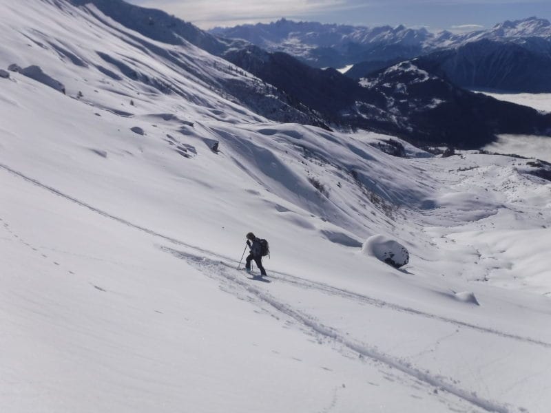 Il s’agit alors de continuer la montée afin de découvrir ce pour quoi on s’est levé le matin : non seulement une vue imprenable sur la Maurienne Ouest à gauche et les barres du Plaisset qui nous surplombent sur la droite, mais aussi Belledonne Nord et une étonnante roche percée (la fameuse Roche Cornue !) Tout cela reposant sur une belle mer de nuages s’étant établie depuis le matin dans la vallée.