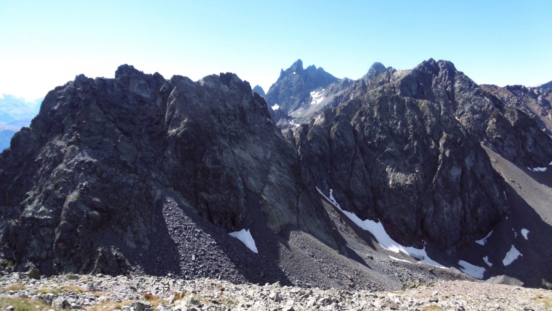 A la Brèche de Roche Fendue, la Pointe du Ferrouillet centrale sud se présente sur notre gauche ; quelques cairns et une trace modeste conduisent rapidement au sommet ; là, on profite d’une vue géniale sur la Croix de Belledonne, le lac de Grandmaison, le massif des 7 Laux, et en premier plan, le Ferrouillet pointe nord et les arêtes de la Scia. Au passage, 2 bouquetins se prélassent sans crainte ; ces lieux peu fréquentés méritent le détour.