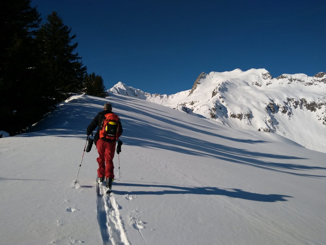 Il y a longtemps que nous n’avions pas eu l’occasion de tracer comme cela. C’est surtout Jean-Noël qui a fait le boulot dans une neige pas si facile et qui enfonçait encore en deuxième position.. Après la légère descente du col du Loup nous avons profité de la trace faite par un groupe de cinq personnes.