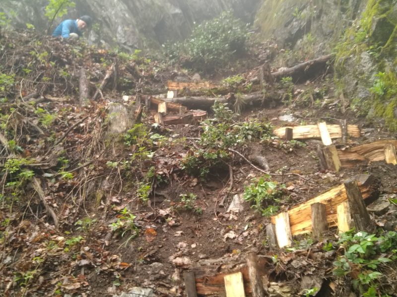 Changement d’une bonne vingtaine de marches sur le sentier d’accès aux voies. Nous avons utilisé des matériaux durables : contre-marches en chêne et piquets en acacia.
