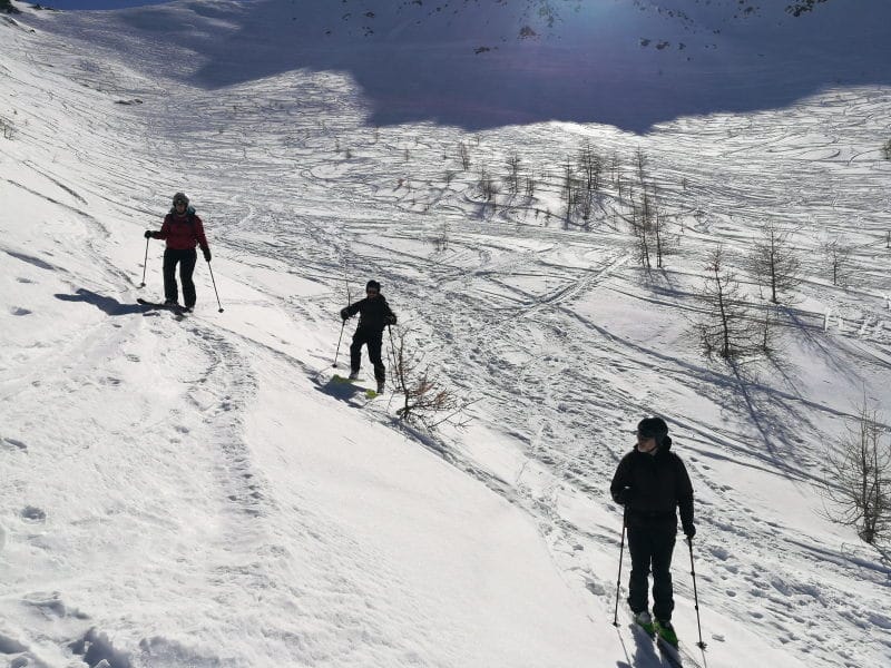 Avec nous se trouvait un autre groupe, qui a continué l’ascension sur l’arête jusqu’à la pointe des Marcelettes pour choper un beau versant de poudre, orienté Nord : ce groupe-là (Sigrine, Fabienne, Bernadette, Virginie, Magali) est revenu à St Véran avec des étoiles dans les yeux et du plaisir plein les jambes, car là-haut, c’était de la pure neige…
