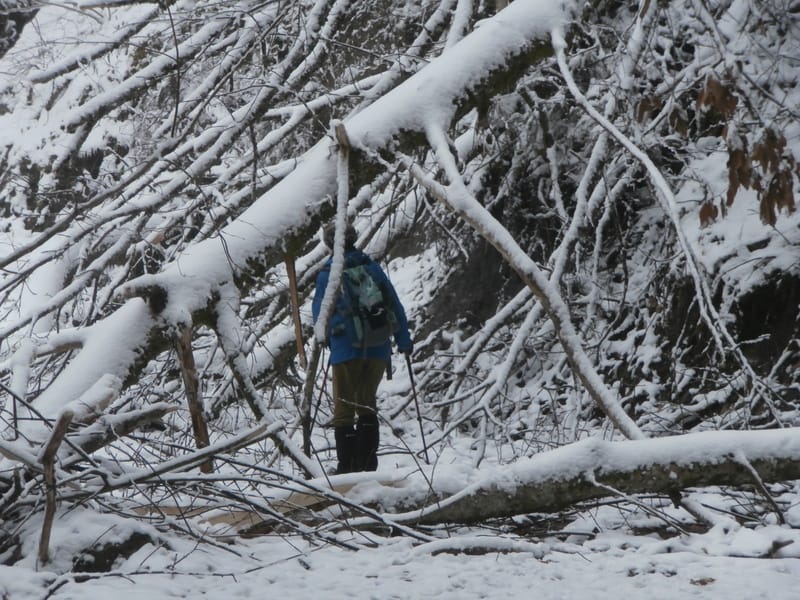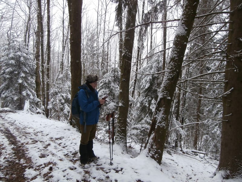 L’ambiance est feutrée, les silhouettes d’épicéas offrent leurs ramures blanchies, les biches et autres habitants des lieux ont dessiné leurs empreintes sur le tapis blanc ; pas une voix (sauf parfois celle de 2 marcheuses emmitouflées), pas un Pierru ! le calme perdure pour cette balade de 3 heures à travers la forêt d’Arvillard.