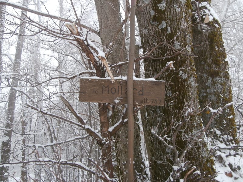Itinéraire : Depuis la place Saint Roch, montée au Molliet, puis sur le sentier de la mine de fer et du four à griller, qui longe le Joudron. Retour au Pont du Chaney, puis accès débonnaire au Mollard bien embrumé ; nous avons alors imaginé le panorama invisible et rêvé être au Canada ou en Norvège !