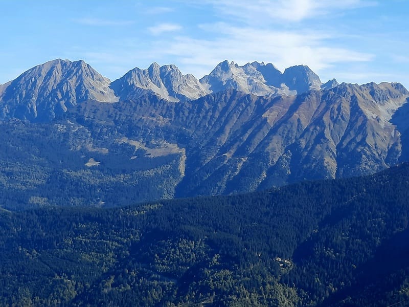 Mais nous avons pleinement profité de l’ambiance encore estivale pour admirer les couleurs fauves de Combe Madame, du Roc d’Arguille, des Grande et Petite Valloire, de Tigneux ; et bien sûr, « nos » Grands Moulins, Charnier, Bacheux, et vers le sud, les Belledonnes des Grenoblois.