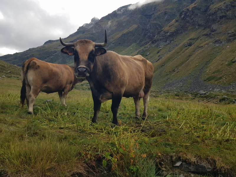 La vue s’ouvre sur le Val de Suze. Le début de la descente s’effectue dans un étroit couloir assez raide, et la pente se maintiendra sur les 400 premiers mètres. Ensuite, on dévale (façon de parler !) le sentier balisé rouge et blanc jusqu’à une zone plus plate et vaste, laissant sur notre droite de beaux troupeaux de vaches et rejoignant des mélèzeraies entourées de mélanges de graminées blondes et fougères vertes. Un enchantement qui durera jusqu’au refuge Lévi-Molinari (1849 m).
