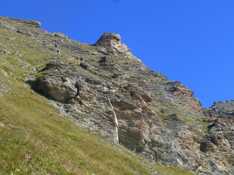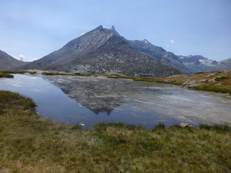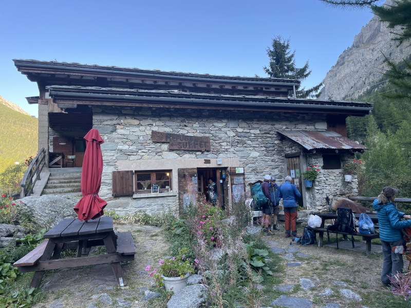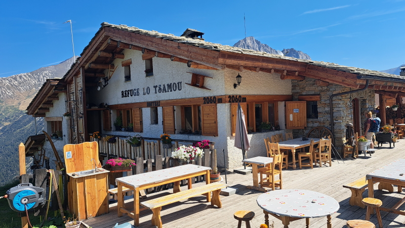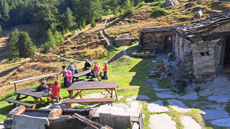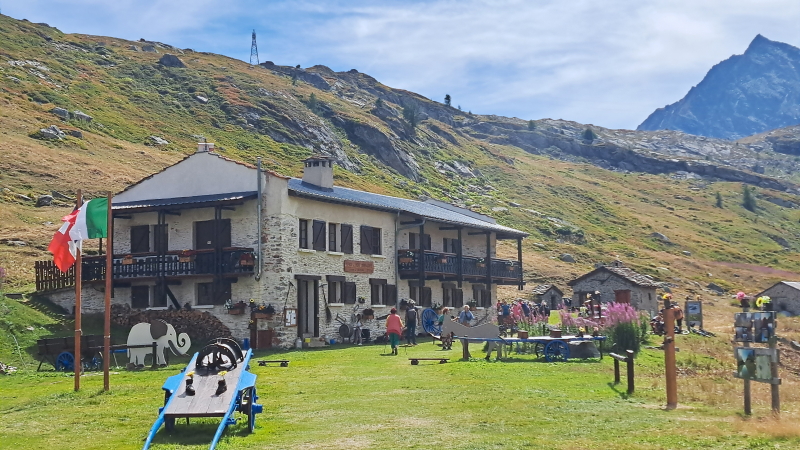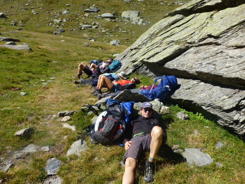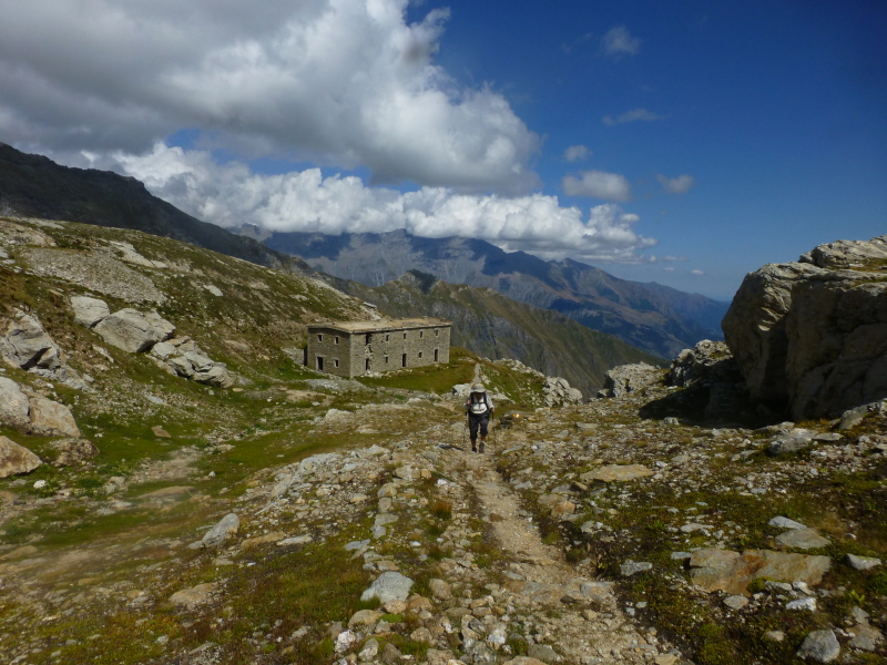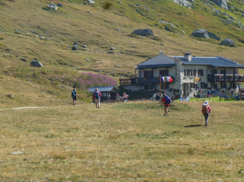 Nous rentrons alors dans le vallon de Tiraculo, très bucolique, où nous arpentons un sentier reposant, après toutefois une descente et une traversée ardues amenant aux granges de Thullie. La suite est plutôt agréable, avec passage devant une belle caserne militaire en pierres, le Rivovero del Gias. Le refuge est sur un promontoire très ouvert. Les bouquetins y sont « comme chez eux ». Le lac del Agnelo, à proximité, fait le bonheur des adeptes de la nage en lac de montagne et des contemplatifs. L’ambiance de la soirée est bien italienne et montagnarde, le gardien Andrea gérant son refuge avec bonhommie.
