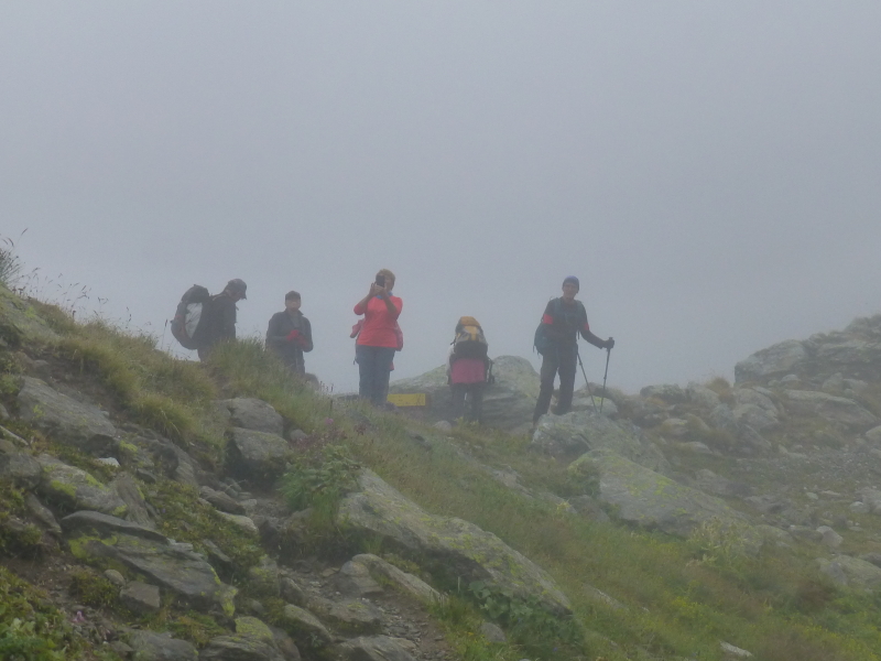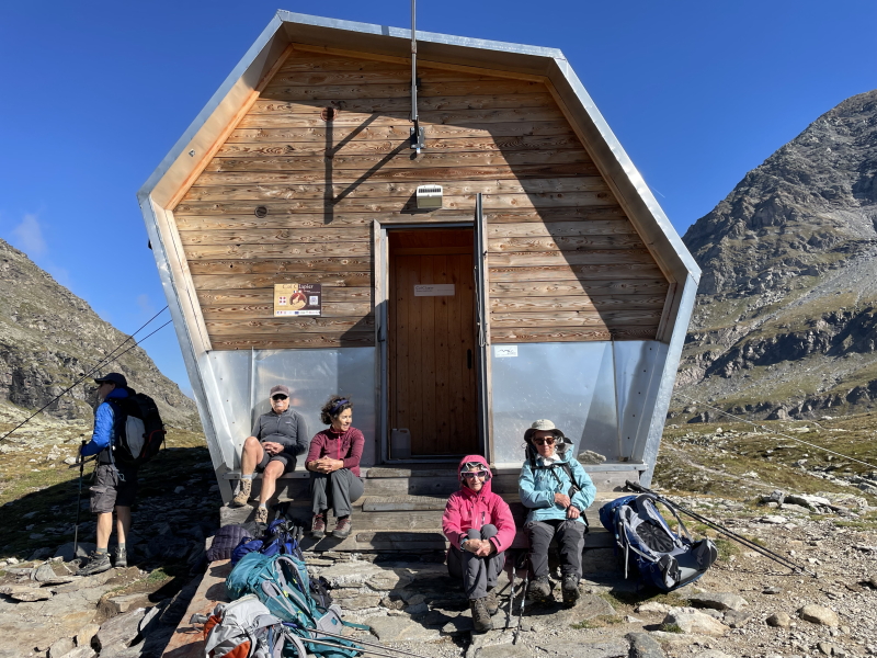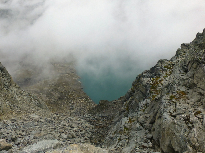 Cette étape menant au Col d’Ambin (2899 m) pour rallier le refuge Lévi-Molinari1, en Italie, fut la plus alpine. D’abord accompagnés de prairies et zones minérales le long du sentier bien tracé en rive droite du torrent d’Ambin, nous sentons la pente se redresser après la bifurcation avec la sente du col de l’Agnel, que nous ignorons. Un passage câblé de roches humides nous mène au-dessus de la conque du magnifique lac d’Ambin. Celui-ci reste voilé par une brume légère, qui laisse apercevoir les eaux turquoise ; séquence « photos » ! Ensuite, courage… pour gravir un vaste couloir rocheux bien raide, balisé de quelques marques rouges, qui nécessite parfois de mettre les mains et débouche sur un beau replat. On profite de cette zone parsemée de névés, de petite végétation et de roches ocre polies par l’érosion, pour rejoindre enfin un superbe abri, le bivouac Walter Reiss, fixé dans la brèche du col d’Ambin, à la frontière franco-italienne. Une photo « pot de fleur » (traduire : « photo de groupe au sommet ») s’impose.
