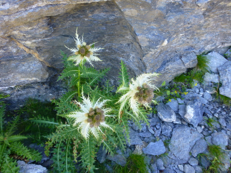 Le départ au soleil matinal est calme, sur des pistes tracés entre les alpages qui passent par la ferme de Mestrallet. Les vaches nous regardent curieusement depuis les fenêtres de leurs stalles (rigolo !). Le col de Bellecombe situé plus au nord (2475 m) est entouré de reliefs assez doux. La suite du parcours se fait hors sentiers, sur des traces confidentielles ponctuées de petites roches blanches en gypse, nécessitant plus d’attention quant aux directions à suivre vers l’ouest. De nombreuses edelweiss égaient les sols pierreux. Le col des Archettes (2510 m) est peu marqué. Sous l’oeil impassible du Mont Froid, nous a y admirons les versants sud du ruisseau de Laméranche, le long duquel nous allons descendre. Ces versants sont couverts de végétation rase striée de grandes coulées écrues de roche de type gypse. Et au deuxième plan, les glaciers de Chasseforêt s’étalent en masse gris-blanc. La Combe des Archettes est bien raide pour nos guibolles dans sa partie alpages, comme dans la partie inférieure. Nous traversons une zone totalement ravagée par tempêtes ou avalanches, les arbres sont couchés, leurs troncs cassés et secs. Un pin à crochets centenaire nous dispense alors son ombre bienfaisante pour le pique-nique bien mérité. Vers Lameranche (1580 m) nous rejoignons enfin le torrent d’Ambin, traversé sur une large passerelle en béton. Là, une remontée de 3 km environ sur le bitume nous ramène à notre point de départ, le refuge du Suffet (1750 m).