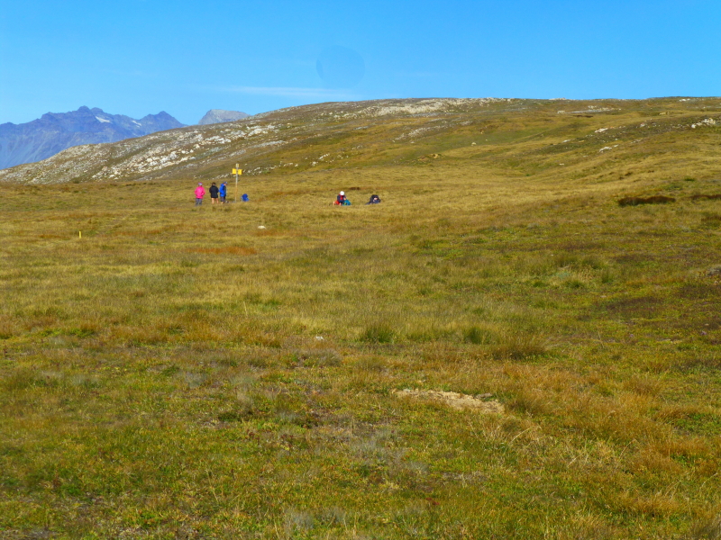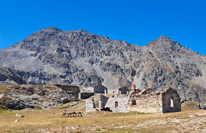 Du refuge, nous partons vers le nord, dans des alpages qui conduisent au Grand Plan. La pente se redresse progressivement, ménageant des vues superbes sur le lac du Mont-Cenis et les vaches brunes qui paissent silencieusement. Ça glisse parfois sur la terre sèche et tant bien que mal, nous gravissons ce pas (2717 m) que marque une borne. Le temps d’admirer encore le lac, nous filons plein nord sur un bon sentier tracé dans les schistes, sous les crêtes de la Cime du Laro. L’ancien fort militaire de la Turra est un ouvrage complexe, fait d’un porche d’entrée monumental, de plusieurs casemates et tunnels communicants, qui permettent la surveillance du col et du lac du Mont-Cenis. Le vent froid s’est invité dans toute cette zone, et nous recherchons un lieu de casse-croûte un peu plus bas. La descente au lac du Mont-Cenis s’effectue par un sentier bien raide au début, fleuri de gentianes asclépiades bleutées.