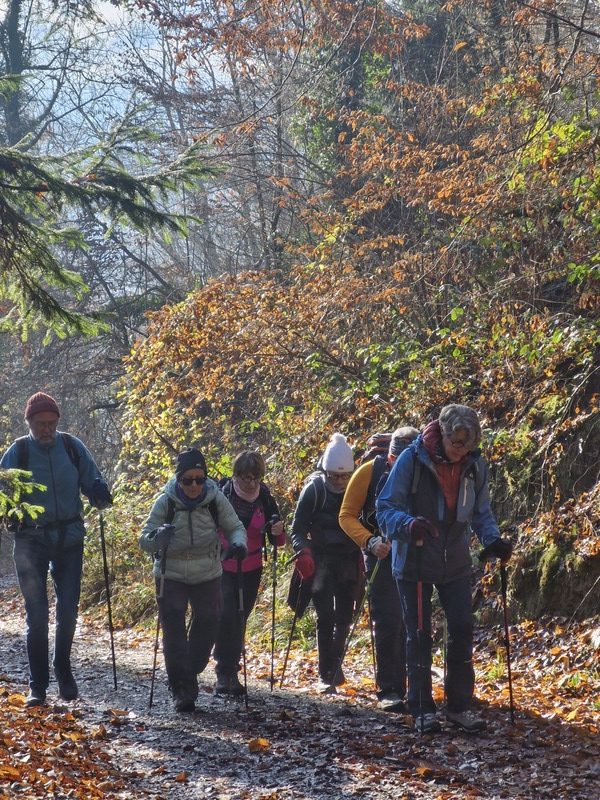 Les Tours de Montmayeur furent une fois encore choisies pour une halte gourmande ( mais bien fraîche à l’ombre de la haute Tour nord !), après 2 h 30 d’un parcours agréable débuté dans le charmant village de La Trinité. Le circuit du jour passait par le col de Cochette, puis rejoignait les ruines de la Chapelle Saint Michel par une piste forestière parfois boueuse, pour enfin accéder aux 2 tours remises en valeur par des passionnés de patrimoine. Ce jour-là, le sol tapissé de feuilles mortes ne fut pas trop glissant, quoique ! L’itinéraire se faufilait le long des crêtes de Montraillant, ouvrant des vues magnifiques sur le massif de la Lauzière bien enneigé, et sur les Bauges.