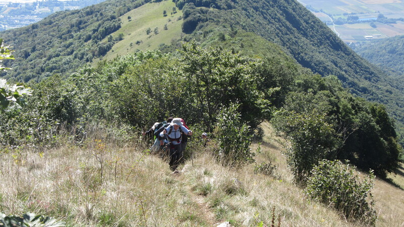 Après la séance de photo de groupe traditionnelle et un au-revoir aux Bretons, nous entamons la descente de l’arête nord-nord/ouest en passant par le mont Pelat. Après 1 km sur le sentier très bien tracé, à 1350 m environ, nous décidons de descendre dans la forêt entre les Adrets et les Fraisses, sur le versant est, pour « couper » : pas de sentier, un ruisseau sec en goulotte avec de petits ressauts rocheux, des pentes bien raides, parfois glissantes, nous amènent enfin vers le ruisseau du Griot. Ayant décrété que « l’aventure est à deux pas de chez nous ! », nous empruntons alors avec plaisir une piste de plus en plus civilisée, qui nous ramène exactement au centre de Routhennes.