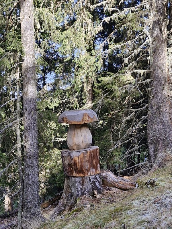 Le sentier jaune, bien balisé et tracé agréablement sur les routes forestières et sur d’anciennes sentes, parcourt la majestueuse forêt communale, laissant voir au passage le chalet de la Vibillarde (1200 m) puis les 2 chalets d’alpage de la Grande Montagne(1450 m) dont nous apprécierons le confort rustique au retour, au moment du pique-nique. Le froid persiste, et nous admirons le décor féérique du givre au sol et sur la végétation ambiante. Au-dessus du chalet du Milieu (qui mérite le détour), nous voilà arrivés à l’ancien « stade de neige » de Val Pelouse. Waouh ! Soleil et vent rafraîchissant rendent ces paysages déjà connus encore « neufs », et nous ne résistons pas à la classique énumération de « nos » sommets locaux, à la mise en boîte d’un « selfie »et à la simple contemplation !