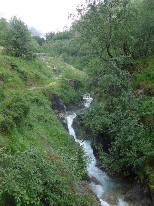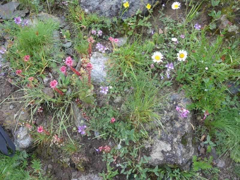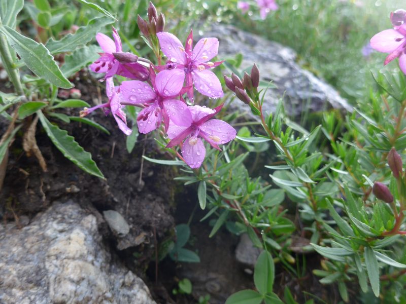 La descente se fait en silence, apaisés d’avoir fait un choix sécuritaire car le passage du col exigeait de la visibilité, mais ce sentiment cède sa place au regret quand la pluie finit par cesser au bénéfice d’éclaircies… Nous sommes déjà bien bas dans le vallon. Cela permet en contre partie de belles photos des fleurs maintenant, et le séchage